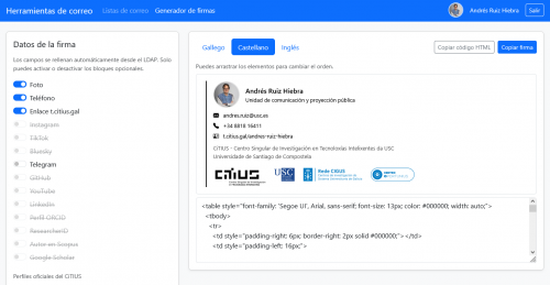 O CiTIUS dispón dunha ferramenta específica para a xeración automática da firma institucional en formatos compatibles cos principais clientes de correo electrónico.