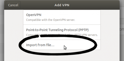 5. Na nova ventá, preme en «Importar dende arquivo…». Neste punto debe aparecer a opción de OpenVPN. Se non aparece, é que non está instalado ben o add-on VPN Client (primer paso).