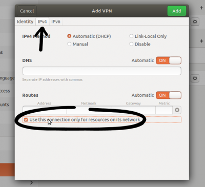 8. Na pestaña IPv4, marca a casilla «Usar só para recursos nesta rede», ou non poderás navegar por Internet con normalidade.